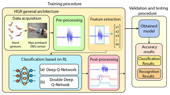 The rest of this article is structured as follows. In Section 2, the proposed HGR architecture that uses EMGs with either DQN or Double-DQN is presented, and each stage is explained in detail. The results are presented in Section 3. The discussion section is presented in Section 4. Finally, the conclusions are provided in Section 5.