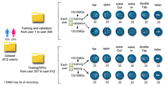 To build the dataset, we used EMG signals of six different hand gesture classes: fist, wave in, open, wave out, pinch, and relax (no gesture). To this end, we used the Myo armband sensor with a sampling rate frequency of 200 Hz for each of the eight channels. The EMG dataset used to develop this work is based on our online dataset, EMG-EPN-612, for which the acquisition protocol can be found in [38]. The EMG-EPN-612 dataset is presented in Figure 2. It can be seen that the dataset comprises 612 users, 306 of which are designated for training and validation for the process to find the best hyperparameter setup and the other 306 of which are designated for testing to evaluate overfitting and to calculate the final results. The data for each user in the training set comprise 300 hand gesture samples, 150 of which are designated for training and the other 150 of which are designated for validation. This division of samples is similar to the test set [39]. The online evaluation system, which is necessary to test our final models, can be accessed on the web page described in [40]. It is worth noting that we only used 20 users for training and validation (out of 306 available users) because the process of testing different user-specific models needed to find the best hyperparameters is computationally expensive and time-demanding. Once we found the best model and the best hyperparameter configuration for the 20 users using the validation set, we used that parameter configuration for training and testing based on the testing data to obtain the final results.