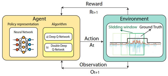 The partially observable Markov decision process (POMDP) proposed in this work uses the DQN or Double-DQN-based algorithm to learn an optimal policy to classify and recognize EMGs. An illustration of the agent–environment interaction using the Deep Q-Network algorithm for EMG classification and recognition is presented in Figure 3. We explain each of the elements of Figure 3 in detail below.