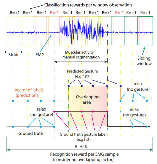 Reward: The reward is a numeric value that the agent receives depending on its performance when interacting with the environment. An illustration of the rewards that the agent obtains is presented in Figure 5. In this work, we used classification rewards, which can be positive ( +1) each time the agent correctly predicts a category label (action) based on a feature vector (observation). If the agent predicts a window label category incorrectly, it receives −1. We also used a recognition reward, which compares the vector of predicted labels with the vector of true labels (ground truth). As can be observed in Figure 5, if the overlapping factor between those vectors is more than 75%, the agent receives a reward ( +10); oitherwise, the agent is penalized with −10.