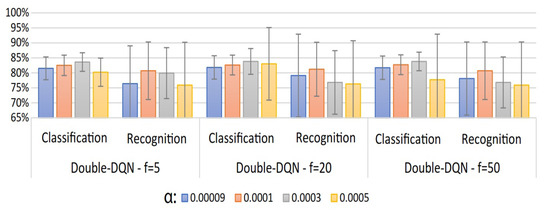| Double-DQN—f = 20 | 0.0001 | 82.6% ± 3.3% | 81.2% ± 9% |