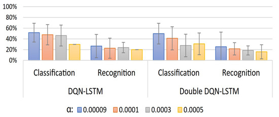 A summary of the classification and recognition accuracy results for 20 users of the proposed user-specific HGR model can be observed in Figure 7, Figure 8 and Figure 9. In Figure 7, we present a comparison of DQN and Double-DQN with update frequency =1. It can be observed that 0.0003 for the DQN-based model achieves the best results: are and for classification and recognition accuracy, respectively. In Figure 8, we present the results corresponding to an increase in the update frequency for the Double-DQN case. It can be observed that for the Double-DQN-based model with update frequency =5 achieved the best results: and for classification and recognition accuracy, respectively. Finally, in Figure 9, we present the results for the DQN and Double-DQN models with an LSTM layer for the agent representation of those models. It can be observed that for the Double-DQN based model achieved the best results for this model: and for classification and recognition accuracy, respectively. This implies that adding an LSTM layer drastically decreases the performance of the agent in classifying and recognizing EMGs using the proposed models. In conclusion, the best model found during the validation procedure was obtained from the results illustrated in Figure 7 with for the DQN-based model, which will be used for the test procedure. In addition, numerical results for the best result of each model are presented in Appendix A in Table A1.