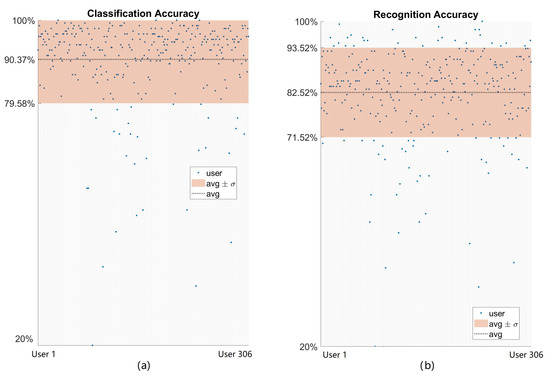 User-specific HGR model results for each of the 306 users of test set with the best hyperparameter configuration: (a) classification results; (b) recognition results.