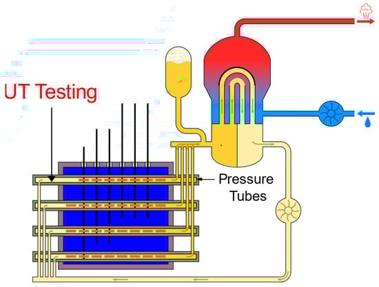 A Canada Deuterium Uranium (CANDU®) nuclear reactor is a Canadian reactor that uses pressurized heavy water to produce electricity [,,,,,,,,]. To ensure the safety and reliability of the reactor for operation, various systems, including the fuel channels, are continually inspected. The pressure tubes, which are core components as part of the fuel channels, must be inspected to locate and characterize flaws that may have developed over time. To determine whether a fuel channel is fit for service, ultrasonic testing (UT), a non-destructive examination (NDE) method, is used to inspect the pressure tube. Using NDE techniques for nuclear power plant inspection has been previously discussed [,,,,,,]. For the inspection of pressure tubes, volumetric and surface NDE examinations are utilized []. As per CANDU design, each reactor contains between 380–480 fuel channels. Each fuel channel consists of a 104-mm diameter (ID), 4.3-mm thick Zirconium containing an inner Niobium pressure tube and an outer calandria tube. Additionally, it contains two stainless steel end fittings. The tubes are approximately 6.3 m long []. Pressure tubes contain the fuel bundles and the heavy water primary coolant. The calandria tube’s role is to keep the heavy water moderator away from the pressure tubes. Figure 1 depicts a high-level design for the reactor core and the fuel channels. During an inspection, a remotely operated tool is used to deliver NDE inspection tools into the defueled channels for inspection. The inspection tools are axially driven along the fuel channel as they rotate, resulting in a helical collection of UT data for each fuel channel. The acquired UT data (B-scans) can be represented as three-dimensional UT data with the following axes: ultrasound travel time (X-axis), transducer displacement (Y-axis), and signal amplitude (shading). This collection of data is examined afterward through manual visualization by a highly trained and certified analyst who is required to have CAN/CGSB-48.9712-2014/ISO 9712:2012 certification. Such analysis can reveal different flaw types that have developed, such as crevice corrosion, debris fretting, and fuel bundle bearing pad fretting (FBBPF).