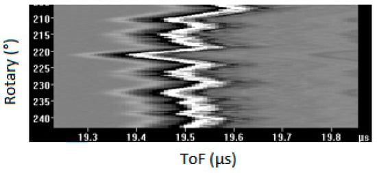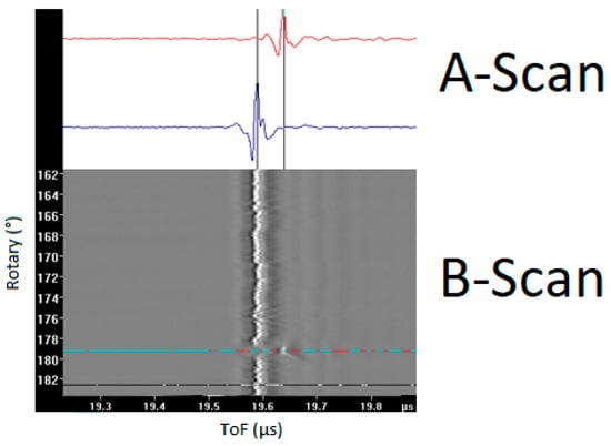The primary objective of this research was to explore the effectiveness of a deterministic auto-sizing mechanism for pressure tube UT scans by automating the analysis of Type-A and Type-D B-Scan files using the 20 MHz normal beam (NB) probe. The difference between Type-A and Type-D files is that the Type-A file contains non-interlaced data using a single probe, while the Type-D file contains interlaced data from two probes. B-Scans represent a series of A-Scan data plotted against a single coordinate variable, as can be seen in Figure 2. A-Scans can be defined as a two-dimensional graphical representation of UT data, with ultrasound travel time as one axis, and signal amplitude as the second axis.