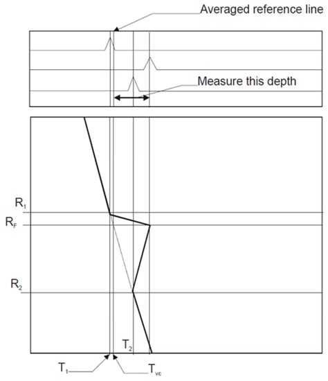 Unlike the first algorithm, which uses linear regression to approximate all ToF, the second algorithm for auto-depth measurement relies on calculating the average ToF for the region of interest (IND location ± width) while excluding outliers. The algorithm obtains the ToF for each A-Scan for the region of interest, it then calculates the standard deviation (σ) using the formula in (5), and finally, it calculates the average ToF for all points within ±σ (standard deviation) using the formula in (6). The average ToF difference is translated into IND depth by multiplying it with a constant, as previously shown in (4). This algorithm follows a similar structure to the segmented linear regression, which is shown in Figure 6, with the difference that the ToF is obtained using the formulas in Equations (5) and (6).