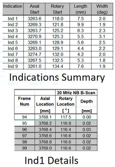 To evaluate the accuracy of the proposed auto-sizing algorithm, a testing environment was developed. This testing environment included developing python functions that can parse the B-Scan data and the corresponding previous inspection results, which are contained in the form of Microsoft Excel worksheets. This allows for automatically evaluating any proposed depth measurement algorithm against an entire outage’s inspection data, which can contain hundreds of indications (IND) representing different flaw types and sizes. For each flaw, the previous analysis results from both Stream A and Stream B were mapped. Figure 5 shows an example of sample reporting using Microsoft Excel sheets that is used by the analysts to report their findings. As can be seen, the summary report includes the axial start, rotary start, length, and width of each indication in one Excel sheet and the detailed report for each indication in another Excel sheet. This includes the exact depth of each A-Scan based on a specific axial and rotary location.