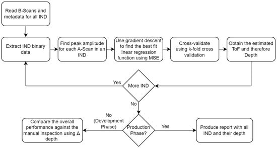 Figure 6 illustrates the flowchart for the proposed segmented linear regression method. As can be seen from the figure, the first step is to read all B-Scan files and then extract all the IND data based on the meta-data provided. Then, for each IND, a separate linear regression function is obtained using the gradient descent algorithm with the MSE loss function, as shown in Equation (3). The function utilizes the peak amplitude ToF for each A-Scan, as shown in Figure 2 and Figure 3. The function is cross-validated using k-fold cross-validation with k = 5 using a 75/25 split. Once the linear regression function is determined for that IND, the approximate ToF and depth are obtained, as shown in Equations (2) and (4). Finally, a report is produced to summarize the details for the INDs locations and depth while utilizing in production. During the development phase, the overall performance is compared against the manual inspection method by using the depth difference (Δ) between various streams to evaluate the overall performance. This is explained in detail in Section 5.