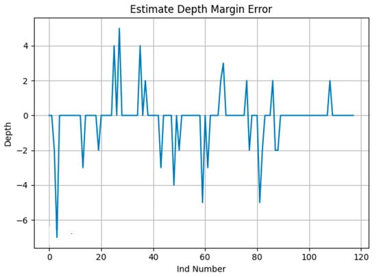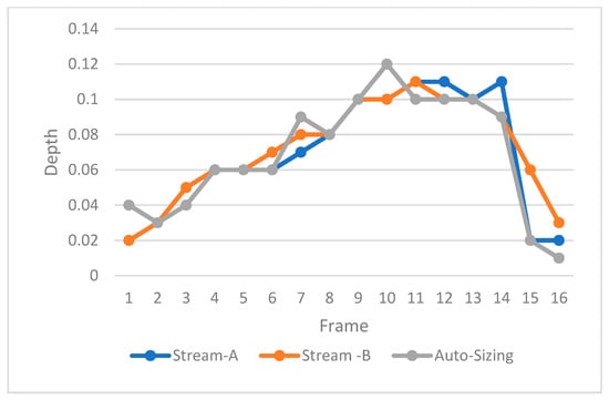A total of 118 INDs were automatically extracted from the data provided by a nuclear operator. The depth of each reported frame in each IND was calculated using linear regression. Furthermore, the depth delta between ‘Stream A’ and ‘Stream B’ was calculated. The testing included a total of 3015 A-Scans. Table 1 presents the relative accuracy of the two proposed algorithms based on all A-Scans in each IND. These results are relative since both Stream A and Steam B are also subject to uncertainty. On the other hand, Table 2 presents the relative accuracy when only considering the A-Scan with the maximum depth in each IND. Table 1 and Table 2 utilize the average depth difference (delta Δ) between ‘Stream A’ and ‘Stream B’ when comparing both streams against the proposed auto-sizing algorithms. Figure 7 shows an example of depth measurement for one IND with 16 A-Scans, while Figure 8 illustrates the depth difference between the auto sizing with linear regression compared to the average depth of streams A and B. This is based on the A-Scans with the maximum depth in each IND, across a total of 118 INDs representing data from one outage. The figure shows the cases when the depth was greater than 0.01 mm.