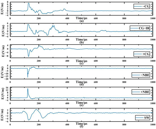 Examples of various lightning electromagnetic pulse waveforms. (a) negative cloud-to-ground flash (−CG); (b) positive cloud-to-ground flash (+CG); (c) negative narrow bipolar event (−NBE); (d) positive narrow bipolar event (+NBE); (e) cloud ground flash with ionosphere reflected signals (CG-IR); (f) far-field skywave (SW).