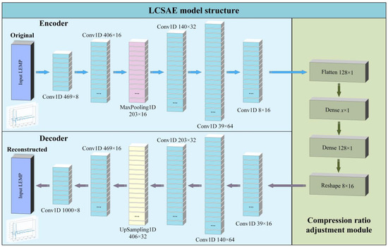 The LCSAE model designed in the experiment consists of three parts: Encoder, compression ratio adjustment module, and decoder. The encoder includes an input layer, five one-dimensional convolutional (Conv1D) layers, and a MaxPooling layer. The compression ratio adjustment module includes a flattened layer, two fully connected layers (one of which adjusts the compression ratio), and a reshaped layer. The decoder includes an output layer, five one-dimensional convolutional layers, and an upsampling layer. The specific structure of the LCSAE model is shown in Figure 6.