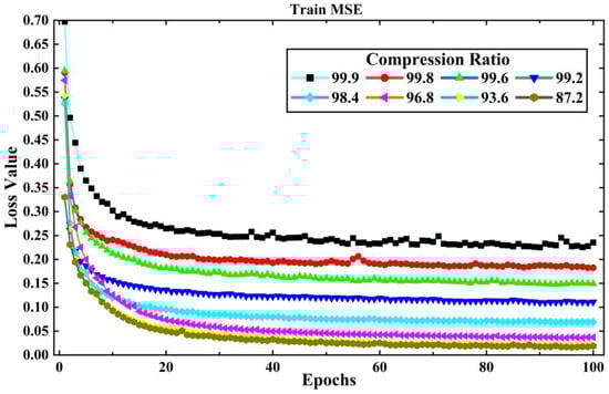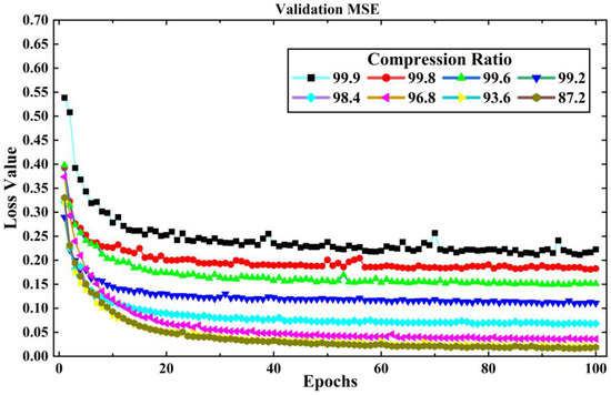 The training set of LEMP waveform data is input into the LCSAE model for training, and the validation set is used to test the reconstruction results after each round of training. Then, the model parameters are updated according to the verification results to prepare for the next round of training, and ends after 100 rounds of training. The original length of the LEMP waveform is 1000, the compression range is between 1 and 128, and the corresponding CR is 99.9% to 87.2%. In the experiment, the LCSAE model is first used to compress and reconstruct the −CG. During the process of the experiment, the loss value MSE for training and validation are shown in Figure 7 and Figure 8. It can be seen that with the increase of epoch, the MSE generally shows a downward trend. At the same time, with the increase of CR, the corresponding MSE of each group also showed an increasing trend. This is because a larger CR corresponds to a smaller feature encoding of the model, and the corresponding compression difficulty will also increase.