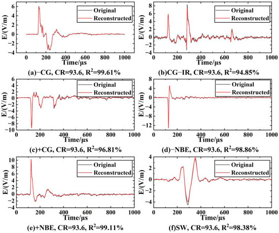 Figure 13 is a comparison chart of the values of the six types of LEMP signals under different CRs. The of LEMP shown in Figure 13 can all reach more than 90% when CR = 93.6% (minimum feature = 64). At this time, the of the −CG signal is the largest at 97.78%, and the of CG-IR is the smallest at 94.25%. The average at this point reaches 96.7%. This indicates that when the minimum compression setting of the LCSAE model is set to 64, signals such as CG-IR experience more information loss during the encoding and compression process compared to other signals, resulting in a decrease in reconstruction accuracy. This is mostly caused by the CG-IR waveform, which has more pulses per event than other waveform types and is more complicated.