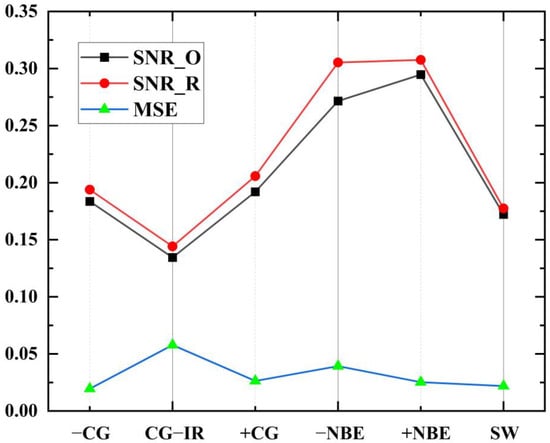 The model was trained separately using the training sets of the six types of waveform data: −CG, CG-IR, +CG, −NBE, +NBE and SW, and the resulting MSE obtained in different experiments was between 0.0176 and 0.3210. As shown in Figure 11, it can be seen that the MSE shows an upward trend with the increase of CR. Meanwhile, it can be seen that the MSE rises slowly before CR = 93.6% (the corresponding compression feature is 64), but the rise of MSE increases significantly after CR = 93.6%. This is because fewer feature codes can express less information. With the reduction of the features extracted by the model, the key information of the LEMP waveform expressed by the minimum compression layer will also decrease, and the difficulty of waveform reconstruction will also increase. Furthermore, Figure 12 compares the experimentally obtained MSE and SNR results at CR = 93.6%. In the figure, SNR_O and SNR_R represent the average SNR of the original and reconstructed data, respectively. This shows that SNR_R is higher than SNR_O, with the smallest difference in SW and the largest difference in −NBE. The CG-IR category has both the smallest overall SNR and the largest MSE among the categories tested. Furthermore, the reconstruction quality of CG-IR signals is poorer than that of the other categories. This can be attributed to the higher complexity of CG-IR signals, which results in a lower SNR and makes feature compression more difficult.