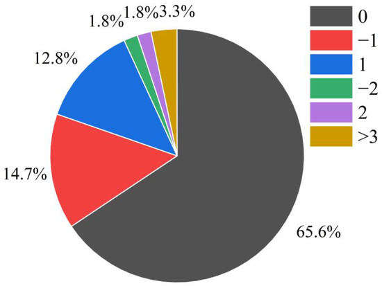 Eventually, we conducted work to compare the peak locations of the original waveform with those of the reconstructed waveform for six types of LEMP data. As a result, Figure 14 illustrates the count of offsets for LEMP signals in the test set. As illustrated in Figure 14, 65.6% of the data had no offset, while 14.7% and 12.8% of the data had offsets with values of −1 and 1, respectively. The number of samples with offset values of −2 and 2 accounted for 1.8% each, and the remaining 3.3% had other offset values. Overall, 93.1% of the peak offsets were less than or equal to one point, indicating that the reconstructed data using LCSAE compression is suitable for subsequent lightning event analysis such as localization and classification.