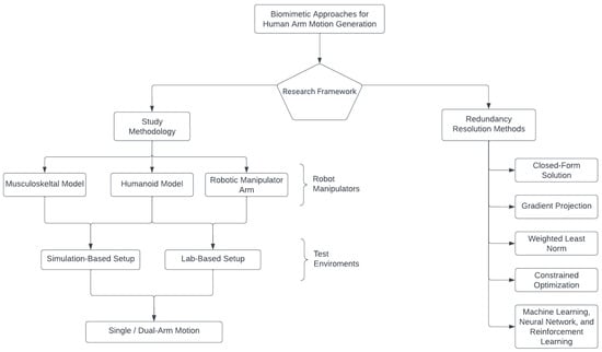This literature review aims to document, categorize, and discuss the results and limitations of the various experimental setups and redundancy resolution methods that mimic human motion when performing various activities for daily living. The classification of the literature based on the experimental setup and redundancy resolution methods are presented in the chart illustrated in Figure 1.