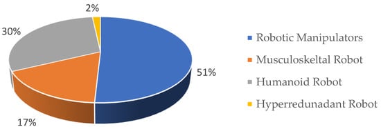 The percentage of papers describing the various robotic systems is illustrated in Figure 2. Based on our literature review, the overall research comprised approx. 51% robotic manipulators, 30% humanoid robots, 17% musculoskeletal robots, and 2% hyper-redundant robots. It was evident from the literature that humanoids and seven degree of freedom manipulators served as the ideal platforms for testing biomimetic algorithms due to their high degree of anthropomorphism.