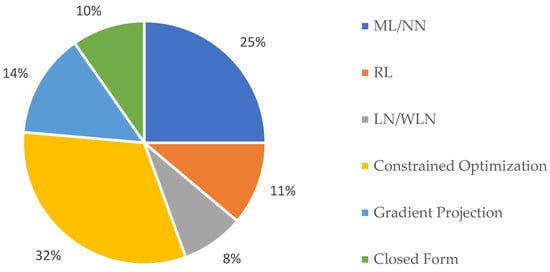 A redundant manipulator chooses a configuration among an infinite number of other configurations based on the performance criteria. This ensures a higher dexterity and flexibility in the motion planning. The human upper body is a highly redundant structure capable of executing various tasks with a high agility and with a relatively large number of degrees of freedom, typically ranging from 20 to 25 DOF [16]. As a result, solving the inverse kinematics (IK) becomes challenging. Many researchers have tried different approaches to simulate human-like motion in robots. The pie chart in Figure 3 shows the percentage of the research articles in diverse categories describing the various methods that were used on the different robotic systems. Overall, 32% of the papers employed a constrained optimization, while 14% used gradient projection algorithms. When reviewing the latest research literature, it was evident that there was a strong trend toward neural networks/machine learning (ML/NN) research (25%) and reinforcement learning (RL) research (11%), with only 8% of the research focusing on the least-norm and weighted least-norm methods (LN/WLN).