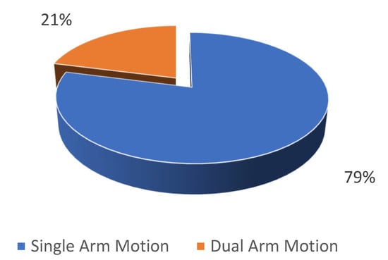 As a result of recent efforts in the field of biomimetics and technological advancements in the field of robot design, dual-arm movements and manipulators with human-like characteristics are among the most trending research topics today. Based on the findings shown in Figure 4, a significant proportion of the included studies (i.e., 79%) primarily focused on proposing techniques for generating single-arm motion. Conversely, a relatively smaller percentage of studies (i.e., 21%) proposed dual-arm motion generation techniques. Several factors can be accountable for a particular outcome. Some of these factors were the manipulators and simulator platforms used for the experiments, as well as the type of tasks the experiments were designed to accomplish. The article by Zanchettin et al. [72] proposed an easy-to-follow relationship between the hand posture (position and orientation) and the swivel angle when performing a task based on the simple relationship between the hand pose and the swivel angle. Using kinematic variables, the authors concluded that this relationship could be easily applied to the control of robotic manipulators through the use of kinematic variables to explain the motion of an arm. Using volunteers to perform the simple assembly-like tasks as the subject of their experiment, the authors conducted an extensive experiment to analyze and establish the relationship between the hand poses and swivel angles using a combination of clustering and multivariate correlation statistics. Based on the results of this study, the model was successfully applied to a humanoid robot, the ABB FRIDA, and demonstrated the model’s ability to generate dual-arm movements that were human-like.