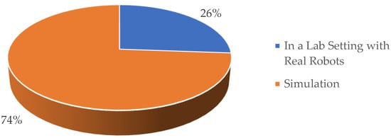 Figure 5 depicts a categorization of the studies that were included in the analysis based on the experimental configurations that were employed for executing the biomimetic principles on robotic systems. As seen in the figure, 74% of the included studies proposed experimental simulation setups for performing biomimetics on robot systems. As a comparison, only 26% of the studies conducted experiments on robots in a controlled lab environment.