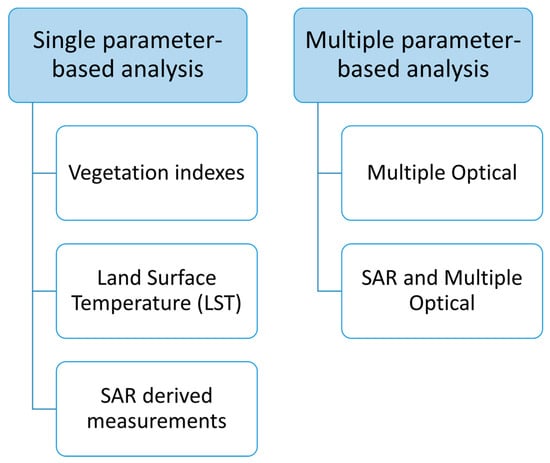 This section describes the works that separately exploit satellite-sensor-derived information acquired at the visible–near infrared–short wave infrared (VIS-NIR-SWIR), thermal infrared (TIR), and microwave parts of the electromagnetic spectrum, respectively. It consists of the following subsections: the vegetation-indexes-based analysis, land-surface-temperature-based analysis, and SAR-based analysis.