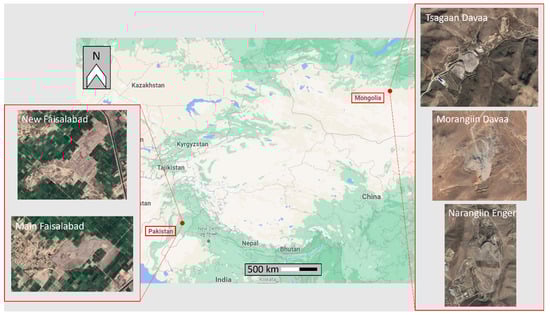 Regarding the choice of the study sites, known dumping sites located in the regions of Pakistan and Mongolia were utilized as test sites. Indeed, as stated in the Introduction, MSW management represents a priority, especially in low- and middle-income countries, where the volume of waste generated is increasing rapidly, and engineered waste disposal systems are often not present. The regions of interest are reported in