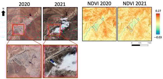 The Tsagaan Davaa landfill is located in Mongolia. A land cover change in the southernmost part of the landfill can be observed between 2020 and 2021, as shown on the left in