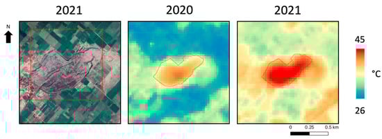 Figure 6). It appeared that there were no evident changes in the surface temperature distribution in the images representing the two years considered and, overall, in the shape of the landfill, the LST was able to effectively delineate the perimeter of the landfill from the surrounding area. It can be noted that the LST values in 2021 were higher than those registered in the same period of 2020 for the same scene, but what is important to underline is that the spatial distribution of the LST values in the images as proportionally conserved. As previously mentioned, since there were no evident changes between 2020 and 2021, the mean values were computed over the entire site area to investigate the possibility of delineating the landfill perimeter using the temperature information. In this case, the comparison of the LST between the two years could be affected by differing annual climatology. To consider this effect, an overall temperature shift was computed between the two images by considering only the area outside the landfill, obtaining a shift value of 5.9 °C. As mentioned, it is worth focusing on the difference between the site’s temperature and the surrounding area’s temperature. For this purpose, the mean LST was computed inside (LST IN) and outside (LST OUT) the site to quantify the difference in both the two examined years. The results, shown in