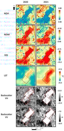 Table 7). Particularly, the NDVI decreased while the NDWI increased by about 0.04 and 0.03, respectively. In addition, the DDI increased, showing a higher difference from 2020 to 2021 when compared to the other multispectral indices (3.78). As previously mentioned, the comparison between the two LST images acquired in different years is affected by a climatology-dependent shift. As in the previous case study, the shift was computed between the two images by considering only the area outside the landfill, obtaining a value of 6.2 °C. Moreover, to evaluate the temperature change due to the waste disposal, the LST was computed by averaging the images over the specific area, i.e., the southern part of the site. As a result, a difference of 8.5 °C was obtained so that if the climatology-dependent temperature shift is subtracted, an increase of 2.3 °C can be associated with the waste disposal that occurred. To provide an overview of the variations related to all the parameters, the SAR backscatter in both polarizations is also listed in