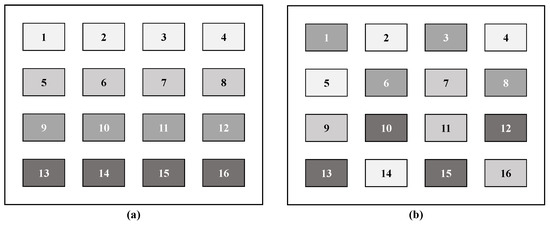 Algorithm 1 specifies the overall optimization of Equation (11) with the grouping of RIS elements scheme. To obtain the grouping strategy, the scattering matrix needs to be initialized. In this paper, the conventional RIS scattering matrix that maximizes the channel gain was used as the initial scattering matrix. After the initialization of the scattering matrix, user scheduling is performed in descending order of the effective channel gain. By performing user scheduling, the scattering matrix can be more adaptive to each UE channel. Then, each RIS element is grouped by allocating the RIS element having the largest channel gain for each UE according to the user scheduling. In this scheme, the number of groups should be greater than the number of UEs in the system. Figure 2 shows the grouping strategy obtained through the proposed grouping scheme and the grouping between adjacent RIS elements represented by general grouping. In Figure 2, the scattering matrix index is based on the index of the figure, and the RIS elements in the same group appear in the same color, e.g., the 1st, 3rd, 6th, and 8th elements of Figure 2b are grouped into the same group.