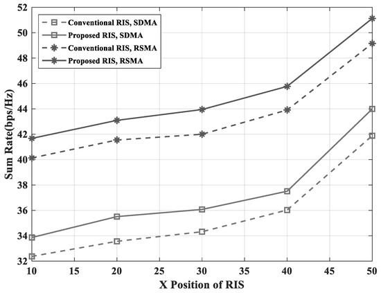 Figure 5 and Figure 6 show that the proposed RIS-assisted RSMA scheme had a higher sum-rate performance than the conventional RIS-assisted SDMA, because the proposed grouping was more adaptive and the RSMA scheme was more flexible in managing the interference. In the simulations, Algorithms 1 and 2 were applied as the proposed grouping scheme and the optimization of RS power-splitting ratio. Furthermore, the number of groups in the simulation was a number that could be divided by the number of elements. Since the number of users was set to 3, the number of groups should be greater than 3 to apply Algorithm 1. Therefore, in this paper, the number of groups was set to 4 and 8. Figure 5 shows the sum-rate performance according to the transmit power of the BS. The RSMA scheme achieved almost the same performance with about 10dBm lower power than the SDMA scheme. Furthermore, the proposed RIS had more improved performance than the conventional RIS. Therefore, it is demonstrated that proposed RIS-assisted RSMA scheme that had a similar performance with a low transmit power was more energy efficient than the conventional RIS-assisted SDMA scheme. In Figure 6, it is shown that the sum-rate performance improved when the position of the RIS was close to the UEs. However the RSMA scheme ensured a higher sum-rate than the SDMA scheme, even if the RIS was far away from the UEs.
