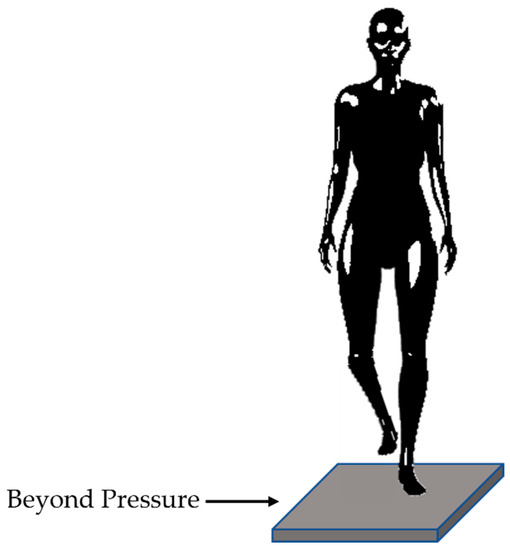 The evaluation of the balance test was conducted using the Beyond Pressure 60 × 50 platform designed by Motustech (Rome, Italy). The platform is composed of 3000 resistive sensors arranged according to 50 rows and 60 columns, with a total area of 598 × 518 mm2. The sensitive area of each sensor is 1 × 1 cm2. The full scale of the sensors is 150 N/cm2, with an acquisition frequency of up to 400 Hz. The matrix is connected to the PC via a USB cable and interfaces with the Beyond Framework Software (Motustech, Guidonia (RM), Italy, version 1.1.0.3). The matrix is covered with a conductive synthetic rubber material in socaprene. The reliability and repeatability of the Beyond Pressure system have already been analyzed by the same authors in a previous study [24]. A one-leg standing balance (OLSB) test was performed [25]: more specifically, subjects were instructed to stand with their arms relaxed at their sides and one limb lifted off the ground by flexing the knee and hip, holding the position for 30 s (Figure 3). The test was performed with open eyes looking at a fixed point on the wall at a distance of 5 m. The subjects were asked to mount the pressure platform without shoes and perform the OLSB test with the right and left limbs, sequentially. Data were gathered from the platform only during the OLSB tests.