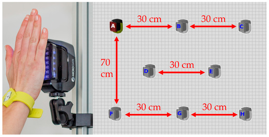 The acquisition of the cognitive tasks was performed through the WittySEM photocell system (Microgate, Bozen, Italy), which has eight photocells, each with an optical proximity sensor and a 7 × 5 LED matrix that can display different colors, arrows in several directions, numbers, letters, and other symbols. The proximity sensor allows one to set the distance between the subject and each photocell by approaching the hand without touching it. In this case, the distance was set to 10 cm. A tablet (WittyTIMER) manages all the photocells via radio communication in real time for the acquisition of events. This system is currently widely used in sports, especially for the evaluation of tasks, such as change of direction, and the training of athletes [26]. The cognitive task consisted of a reactivity test (RT) where the subject had to distinguish the LED target based on the color. The LED matrices were positioned as shown in Figure 4 by attaching them to a metal structure using the clamps supplied by the company. The subject was positioned at a distance of 60 cm from the structure in a monopodalic support using the dominant limb. The subject was asked to approach the hand as quickly as possible to the only LED matrix, where a green rectangle was shown in order to “turn off” the LED. The other LED matrices showed rectangles with different colors. During the execution of the test, the subject could use both upper limbs to turn off the LED matrices. A new sequence of symbols was shown on the LED matrices after 300 ms. The sequence of the target was random. The test had a total duration of 30 s. The RT test is generally used as a method to evaluate the time between the stimulus and the response of a subject [27]. Figure 4 shows a schematic of the WittySEM positioning.