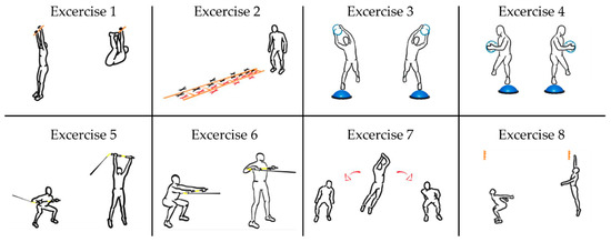 The training circuit consisted of eight exercises involving the whole body performed in sequence, as shown in Figure 5. A workstation was dedicated to each exercise. The duration of each exercise was 30 s, with a 30 s break between each exercise. Participants were asked to exert maximum effort during the execution of the exercises and attempt to carry out the greatest number of repetitions while maintaining correct execution. For this scope, an operator provided verbal encouragement during each exercise to ensure that the participants performed the exercise at high intensity. In the following section, the details of each exercise are reported: