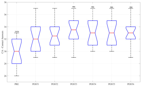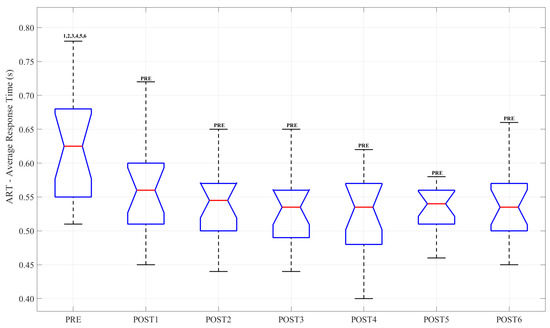 Boxplots related to CA, ART and NE for each experimental session are reported in Figure 6 and Figure 7, respectively. In each graph, the significant differences are highlighted. From the analysis of the results, statistical differences emerged for the CA parameter between the PRE session and the POST3, POST4, POST5 and POST6 sessions (p-value = 0.007, p-value = 0.017, p-value = 0.012, p-value = 0.020, respectively). Concerning ART, significant differences emerged between PRE and all post sessions; specifically, POST3-PRE (p-value < 0.001), POST4-PRE (p-value < 0.001), POST5-PRE (p-value < 0.001) and POST6-PRE (p-value = 0.01). There were no differences between post sessions.