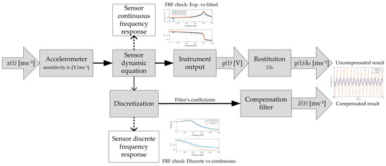 An overall view of the method is presented in Figure 1. The measuring device, operating in continuous time, is modelled through its differential dynamic equation and its corresponding continuous-time frequency response. This equation is discretized by a suited method, and the corresponding finite-difference equation is used to develop a filter that performs the required dynamic compensation.