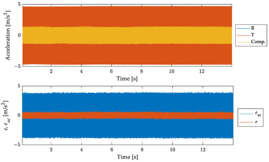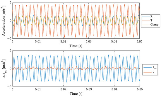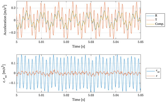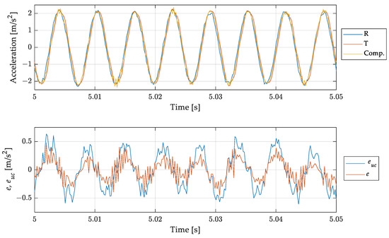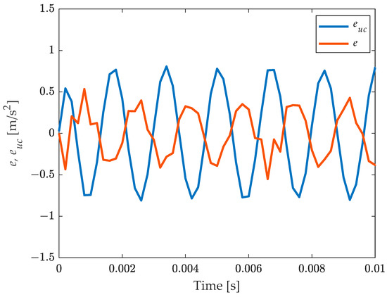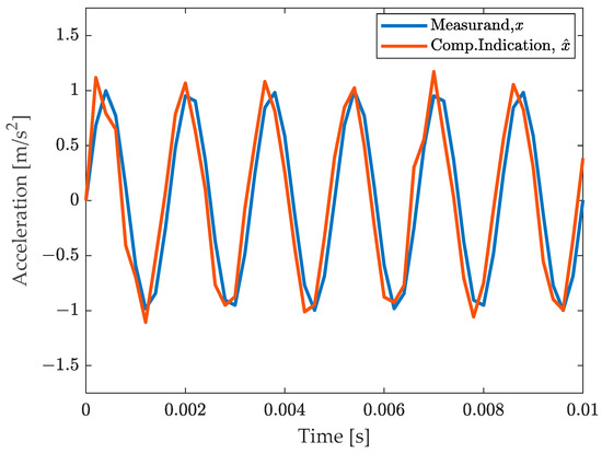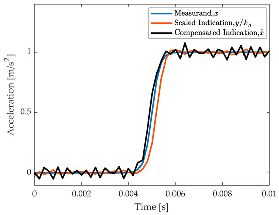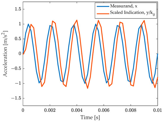 The system response was calculated by integrating the differential Equation (18) by a fourth order Runge–Kutta method. The result is shown in Figure 2, where the measurand, is compared with uncompensated result, , where is the instrument indication (voltage). Therefore, the signals in the figure are both accelerations and can thus be directly compared. The amplification of the amplitude and the phase delay effect can be noted.