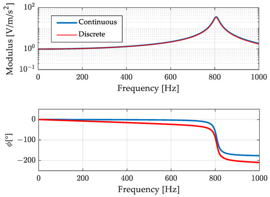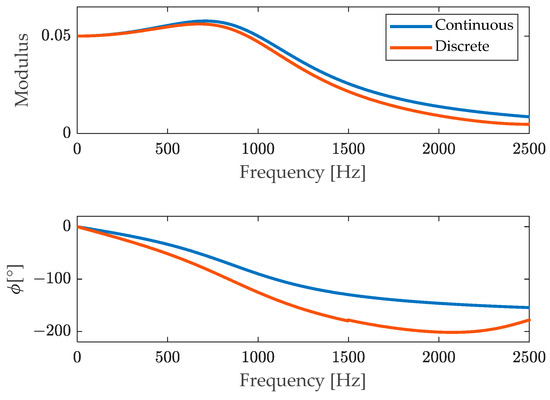 In order to check that the finite difference equation provides a good approximation of the original continuous-time differential Equation (18), the corresponding frequency responses were compared, as shown in Figure 3.