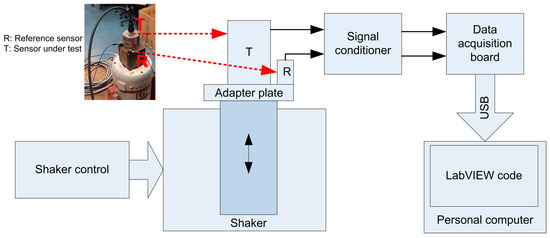 The experimental set up consisted in two accelerometers excited by an electromagnetic shaker and mounted on a shaker’s adapter plate. The plate and fixation methods for the accelerometers (screw for the accelerometer under test and epoxy for the reference) can be considered rigid in the frequency band considered [27,28]. In the test setup, the sensor to be tested (T) was a low frequency accelerometer (PCB model 393B31), whilst an accelerometer with a higher bandwidth compared to T (PCB model 333B30) acted as the reference (R) (see Figure 7). Some important technical details of the sensors involved in the experiment are reported in Table 1.