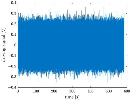 Vibrations were generated by means of an electromagnetic shaker driven with a random signal (see Figure 8) in the 20–4500 Hz frequency band (see Figure 9). The signal was sampled with a sampling rate and acquired for about .