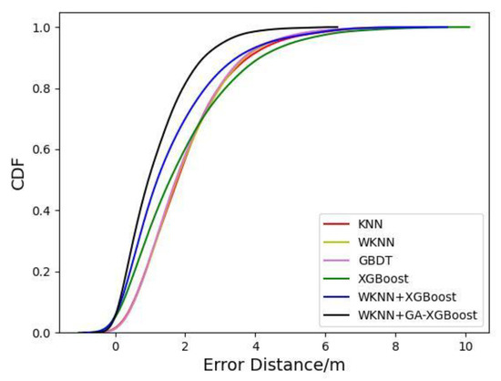 - By fusing WKNN and XGBoost algorithms, an indoor-fingerprint-positioning algorithm based on WKNN+GA-XGBoost was put forward in this study. The experimental results revealed that compared with the other five algorithms, the proposed algorithm reduced the positioning error by 20.26–45.58%, with the RMSE and MAE reduced by over 25%. Moreover, the CDF curve of this algorithm could converge faster.