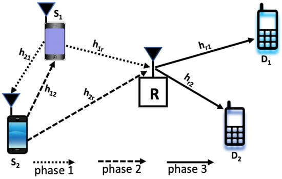 We consider a cooperative downlink NOMA scenario as shown in Figure 1, where two source-destination pairs, and , communicate through a shared relay node R. R is considered a single antenna half-duplex relay employing a DF strategy. Due to deep fading or blocking, there is no direct connection between the and links []. Thus, their data exchange relies on the relay node R. Further, to facilitate D2D bidirectional communications, the source nodes and communicate with each other by exchanging D2D messages. We have also assumed that channel state information (CSI) is perfectly known to the receivers and is in line with previous works such as [,]. The nodes are assumed to be equipped with a single antenna and operate in the half-duplex mode. The channel between any two nodes is subjected to the independent Rayleigh block fading plus additive white Gaussian noise. Furthermore, ∼) is the complex channel coefficient between and R node with zero mean and variance . Similarly, ∼, ∼, and ∼ are the complex channel coefficient for the links , , and , respectively. In addition, ∼ is the complex channel coefficient between and nodes with zero mean and variance . The channel between and node is considered reciprocal. Therefore, . Furthermore, without the loss of generality, we consider that and . So, it is expected that , and . Though and may not guarantee , and , it is a simple but effective strategy to employ this assumption under statistical channel state information []. This is also in line with previous works such as [,]. As shown in Figure 1, the data transmission of the BCD-NOMA scheme is divided into three communication phases which are described below.