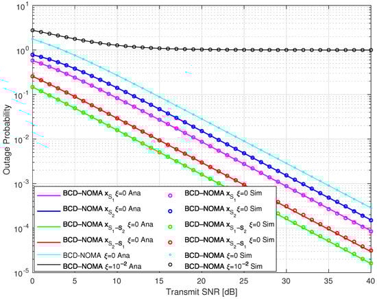 For simplicity, we consider the normalized distances of the nodes and the relay node as in [], i.e., , , , and . Furthermore, path loss exponent vs. is set to 4, and fixed NOMA power allocation method is used [], i.e., , , , , , and . We average over randomly generated Rayleigh block fading channels in MATLAB to run the Monte-Carlo simulation and obtain the simulation results. The list of simulation parameters are given in Table 1.