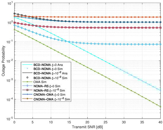 Outage probability comparison of BCD-NOMA scheme with benchmarks.