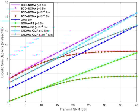 In Figure 4, we compare the ESC of the BCD-NOMA scheme with the benchmark schemes. We observe that the ESC performance of the BCD-NOMA scheme, especially for the pSIC case, outperforms all the benchmark schemes against all transmit SNR values. The ESC performance gain between pSIC and ipSIC depends on the level of residual interference. It can be clearly observed at medium to high values. Moreover, at higher values, the hybrid CNOMA-OMA scheme has almost comparable ESC performance with the BCD-NOMA scheme. This is because in a hybrid CNOMA-OMA scheme, the D2D nodes, i.e., and , transmit at full transmit power in the last two time slots, thereby increasing their overall ESC performance at high values. In addition, a close match between the analytical and simulation results is observed in Figure 4, which indicates that our derived analytical expressions for the BCD-NOMA scheme are intact.