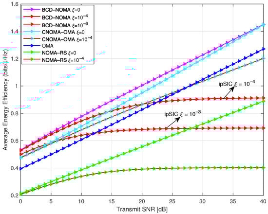 Energy efficiency (EE) is an important metric to check the performance of next-generation wireless systems. The EE metric is defined as the ratio of the total data rate of the system over the total energy consumed by the system []. In Figure 5, we compare the average EE of the BCD-NOMA scheme against all the benchmark schemes. We notice that our proposed BCD-NOMA scheme is more energy-efficient compared to all other schemes. Moreover, we can also observe that ipSIC tends to lower the EE performance and thus significantly impacts the ESC performance. Therefore, more intelligent SIC techniques can further enhance the ESC and EE performance of the proposed BCD-NOMA system.