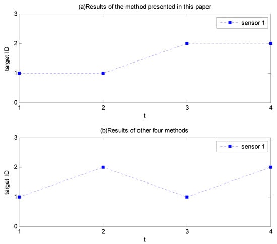 The specific processing process of the five methods is shown in Table 1, and the sensor assignment results are shown in Figure 4. Figure 4a shows the sensor assignment results of the methods in this paper, and Figure 4b shows the sensor assignment results based on the information gain, discrimination, discrimination gain, and quadratic entropy. It can be seen that after the sensor detects the target in the first second, the sensor assignment and identification results are the same for the five methods. However, in the second, since the information obtained by the detection of target 1 is smaller than that of target 2, the method based on information theory is chosen to detect target 2, while the proposed method continues to detect target 1. Thus, after two seconds, the proposed method makes target 1 confirmed recognition, while the other four methods cannot confirm the recognition of any target. Finally, all five methods can complete the recognition confirmation of two targets after four seconds, and the correct recognition rates are 100%, but the average recognition confirmation time of our method is 3 s, while the other methods are 3.5 s.