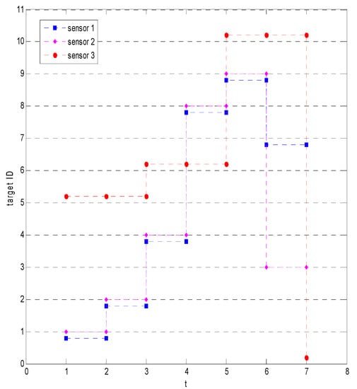 The results of the proposed method and the results based on information gain are shown in Figure 5 and Figure 6, respectively. The horizontal axis in the figure is time, the vertical axis is the target number, and the three curves indicate the targets assigned to be detected by the three sensors at each moment, taking Figure 5 as an example, the target numbers detected by sensor 1 in seven cycles are 1, 2, 4, 8, 9, 7, and 7. It can be seen from Figure 5 and Figure 6 that the proposed method can continuously allocate two sensor resources to low uncertainty targets at multiple moments, so that the target can be quickly confirmed identified. Additionally, the proposed method does not allocate all three sensors to the same target. However, other methods allocate sensor resources to multiple targets evenly at the beginning, so as to maximize the total reduction in uncertainty for all targets but give up the concentration of resources to make the low uncertainty target reach the recognition degree as soon as possible, resulting in a long time to complete the identification of all targets. The comparison results show that the proposed method can allocate sensor resources appropriately and without waste. The performances of different algorithms are shown in Table 2. The correct recognition rate of the proposed method is 100%, which is better than or equivalent to other methods. The average recognition–confirmation time is 4.1 s, and the final target identification–confirmation time is 7 s, which are the shortest of all methods.