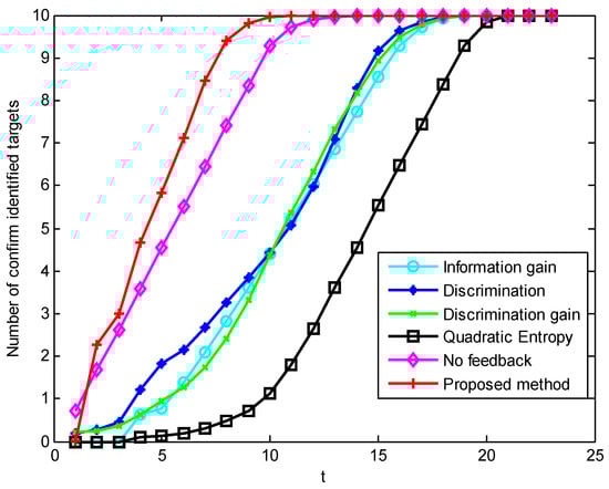 Assume that 10 targets are detected using three sensors in scenario 3. The proposed method is compared with the methods based on information gain, discrimination, discrimination gain, and quadratic entropy under the same conditions. The true categories of each of the 10 targets are fixed as follows: 3, 2, 2, 1, 3, 2, 2, 2, 2, and 1. The initial recognition probability distribution of the fusion center is the same for the 10 targets. The corresponding observations are generated in the simulation according to the true class of the targets, rather than randomly based on the probability of occurrence of the measurement.