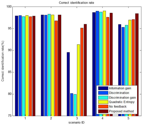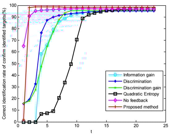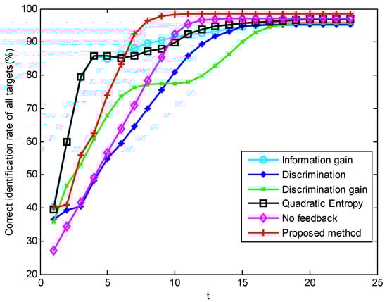 The proposed method is compared with the methods based on information gain, discrimination, discrimination gain, and quadratic entropy. In step 2 of the identification confirmation process in Section 3.3, if the probability that target i belongs to a class is greater than or equal to the recognition confirmation threshold, then the recognition process for that target is ended. The recognition confirmation time of target i is . If the final identified target category of target i is the same as the true category , it is judged to be correctly identified and the number of correctly identified targets is added to 1. When all targets have been confirmed for identification, statistics of the correct recognition rate of this simulation and the average confirmation recognition time is .
